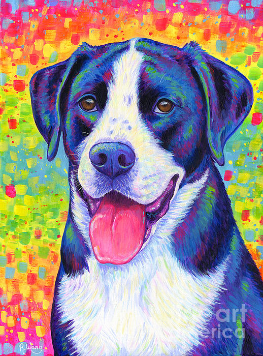 A colorful portrait of a black and white bicolor mixed breed dog named Pumba in bright rainbow colors. Original acrylic painting on canvas by Rebecca... more