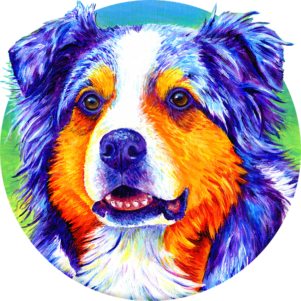 A colorful portrait of Jerry, a blue merle Australian Shepherd Dog. This lively and vibrant portrait is created with bright colors, including... more