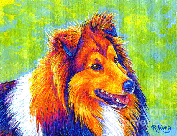 A colorful portrait of a Shetland Sheepdog (Sheltie) in bright rainbow colors. Painted with acrylics on textured art paper.