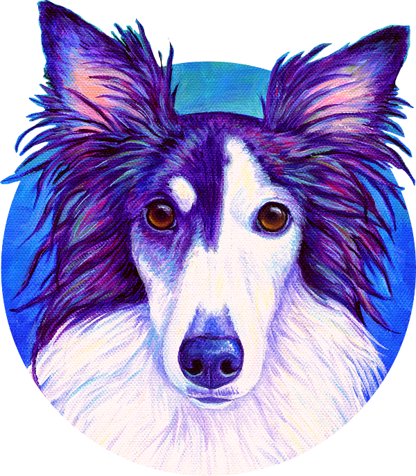 A colorful pet portrait of a Silken Windhound named "Pie" in vibrant colors. Acrylic painting on stretched canvas. The Silken Windhound is a relatively new breed of sighthound, developed in 1985 in the United States. They were created from crossing the Borzoi (Russian Wolfhound) , whippets, and other sighthounds. They appear like a small version of the larger Borzoi.