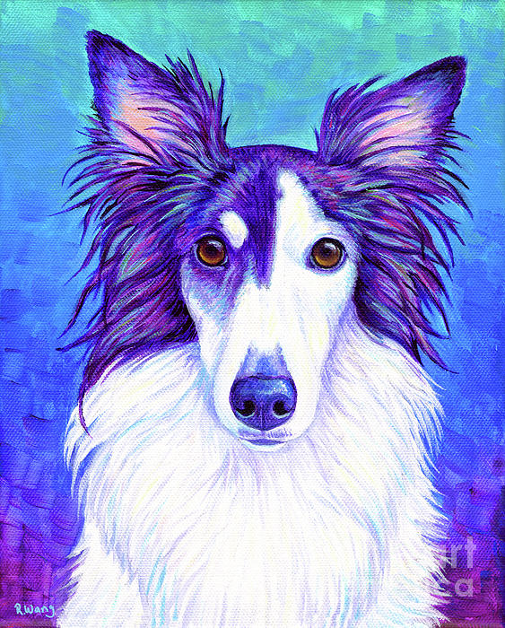 A colorful pet portrait of a Silken Windhound named "Pie" in vibrant colors. Acrylic painting on stretched canvas. The Silken Windhound is a relatively new breed of sighthound, developed in 1985 in the United States. They were created from crossing the Borzoi (Russian Wolfhound) , whippets, and other sighthounds. They appear like a small version of the larger Borzoi.
