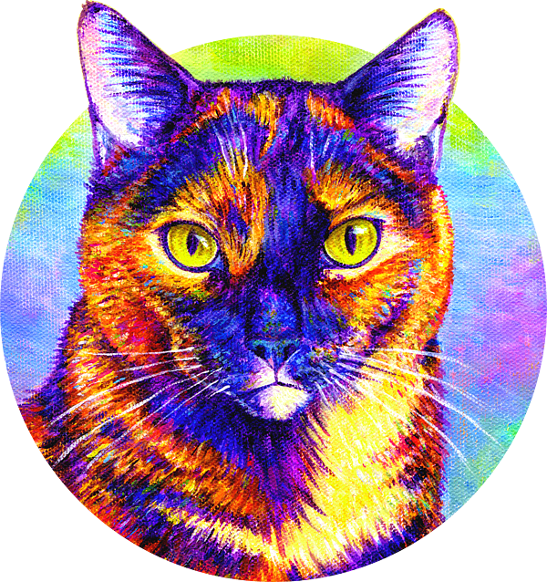 A colorful portrait of a tortoiseshell cat named Itty Bitty with vibrant rainbow colors. Torties are super colorful cats already, but this portrait... more