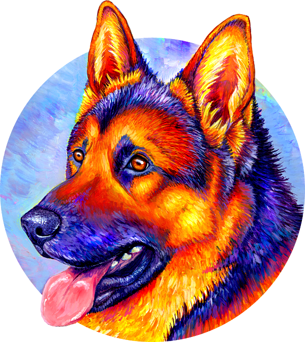 This colorful and expressive acrylic painting of a German Shepherd Dog was painted by artist Rebecca Wang. The traditionally tan areas of this dog were painted with bright warm colors, such as red, orange and yellow. The black areas were painted with dark blues and purples. The background is a blend of lighter blues and purples, which complement the cool tones in the dog and provide contrast for the oranges and yellows.