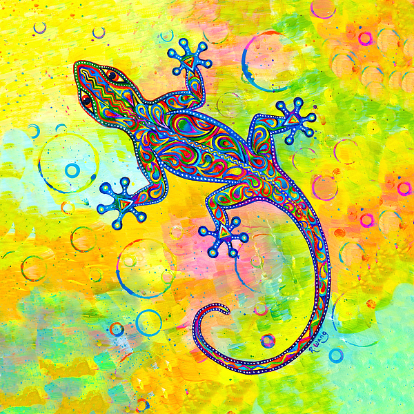 A stylized painting of a gecko lizard with vibrant rainbow psychedelic paisley patterns all over. The boundary is a gradient of green, blue and purple with white dots inside. The background is a playful experimental abstract design of pastel rainbow colors, circles, and paint splatters. Inspired by bohemian, psychedelic, and hippy styles.