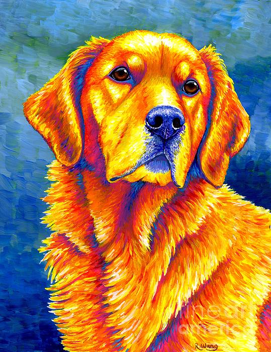 A colorful and expressive Golden Retriever dog, painted with acrylic paints on board. I used bright rainbow colors to portray this dog portrait. Red, orange, yellow, purple, magenta, and blue make this portrait vibrant and almost glowing, against a teal and blue background.