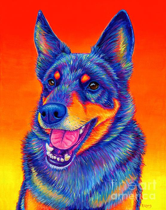 A colorful portrait of a blue heeler named Hyside in bright rainbow colors, on a sunset background. Artwork Copyright © Rebecca Wang,... more