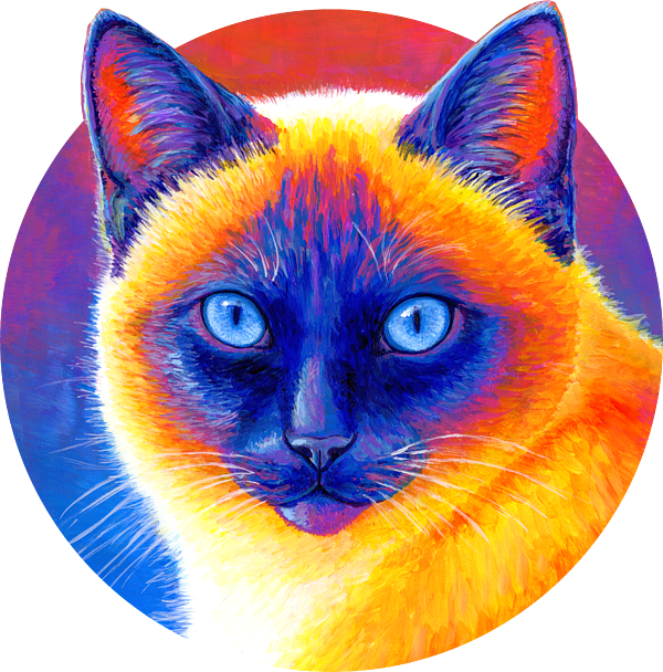 "Jewel of the Orient" A vibrant and colorful portrait of a Siamese cat with stunning Topaz eyes. Painted with acrylics on board. This is a traditional, or applehead, Siamese, also known as a Thai Cat or Wichien Maat. These were the original royal cats of Thailand (Siam). This painting is based off of a seal point, which is typically a cream color with dark brown markings. The "points" are represented with blues, purples, and magenta, while the cream is represented by yellow and orange. She is lit from behind and to the left.