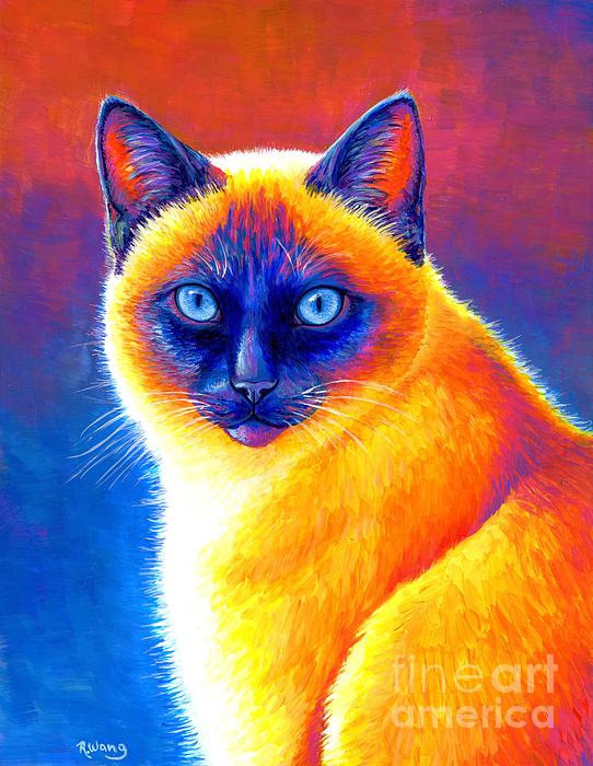 "Jewel of the Orient" A vibrant and colorful portrait of a Siamese cat with stunning Topaz eyes. Painted with acrylics on board. This is a traditional, or applehead, Siamese, also known as a Thai Cat or Wichien Maat. These were the original royal cats of Thailand (Siam). This painting is based off of a seal point, which is typically a cream color with dark brown markings. The "points" are represented with blues, purples, and magenta, while the cream is represented by yellow and orange. She is lit from behind and to the left.