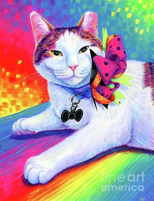 A colorful pet portrait of a cat named Merkemer in bright rainbow colors.