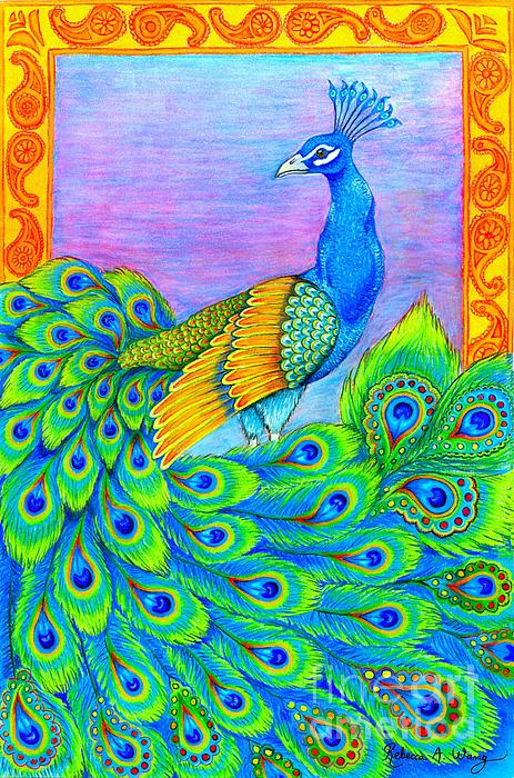 A pretty peacock shows off his colorful tail feathers with abstract embellishments. Drawn with pastel pencils on grey-tinted Strathmore paper.