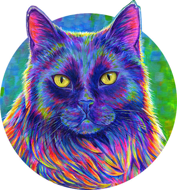 A colorful portrait of a long haired black cat named Felix in a bright bold psychedelic style with rainbow colors. Acrylic painting on canvas. In the original reference photo, this kitty was laying down on the carpet in front of a sofa, with the light coming from behind. I sought to replicate the dramatic backlighting, while striving to make it as colorful as possible. I used a palette of full saturation colors for this cat portrait. Most long haired cats have fur that is a lighter color on the areas with the longest fur, such as the neck, belly, and rear end. In long haired black cats, this can be very pronounced, with the fur in these areas being various shades of grey, in contrast to their face, legs and back which are black. In addition, many black cats can experience "bronzing" of their coat, where the black takes on a rusty brown color due to sun bleaching. This is why the mane of this cat and his belly fur are so much lighter than the face in the painting.