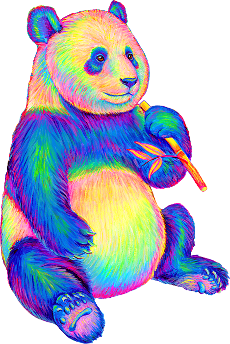 A colorful painting of a giant panda bear in a bamboo forest in bright psychedelic rainbow colors.