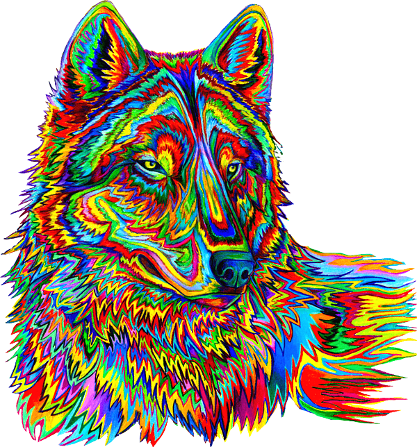 A psychedelic rainbow wolf, a different kind of wolf portrait! Psychedelic wolf done in rainbow colors. This vibrant and colorful wolf portrait is a fresh take on a common subject. Highly saturated rainbow colors create different tones and shadows in the fur, then fade out on the right to abstract wavy lines.