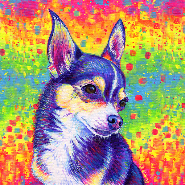 A vibrant pet portrait of a tricolor chihuahua dog named Bruce in psychedelic rainbow colors!