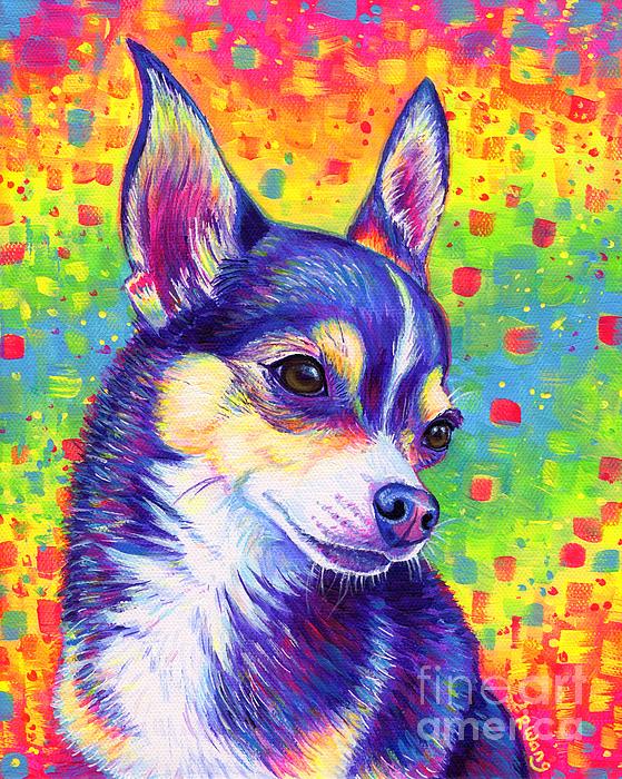 A vibrant pet portrait of a tricolor chihuahua dog named Bruce in psychedelic rainbow colors!