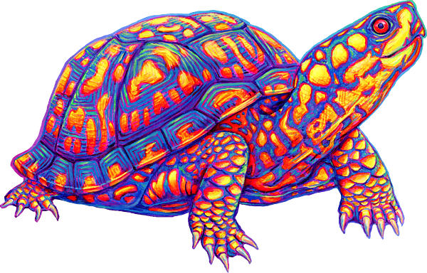 A colorful painting of an Eastern Box Turtle (Terrapene carolina carolina) in bright rainbow colors with a vibrant multicolored background. Acrylic... more