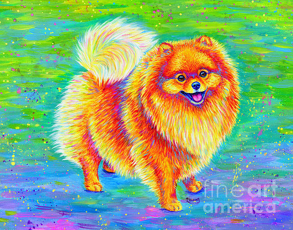 A colorful portrait of an orange Pomeranian dog in vibrant rainbow colors. Original artwork is an acrylic painting on wood panel. The Pomeranian is a breed of Spitz dog that is named for the Pomerania region in Europe. They are descended from the larger German Spitz, and are known as the zwergspitz, or dwarf spitz, in Germany.