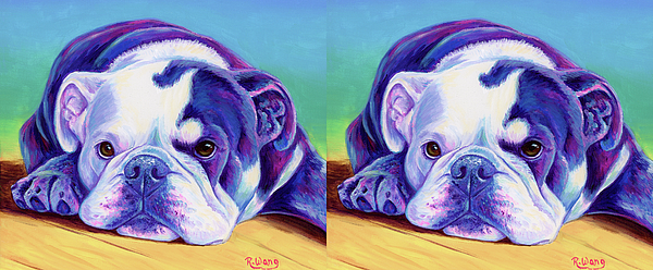 A colorful pet portrait of an adorable piebald English bulldog named Ruby in vibrant rainbow colors, especially lots of blue and purple.... more