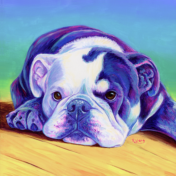 A colorful pet portrait of an adorable piebald English bulldog named Ruby in vibrant rainbow colors, especially lots of blue and purple.... more