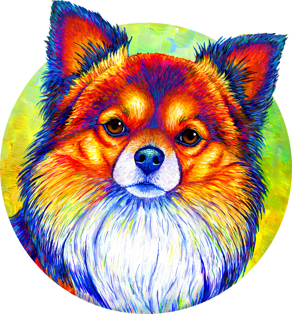 A colorful and expressive sable long-haired chihuahua dog painted with acrylics in bright rainbow colors. Sable colored dogs have a base coat of reddish-brown hairs tipped in black. This sable chihuahua is also a tricolor because it has white fur on its face and chest. The brownish areas of the dog were painted with bright warm colors, such as red, orange, yellow and magenta, while the black and white areas are represented with cool colors (purple, blue, and green).