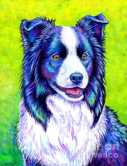 A colorful and expressive border collie painted with acrylic paints. A delightful and energetic border collie, represented with a rainbow of colors.... more