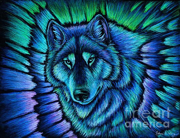 An ethereal wolf spirit appears in the green and blue lights of the Aurora Borealis (northern lights). Koh-i-noor Gioconda pastel pencils on black paper.